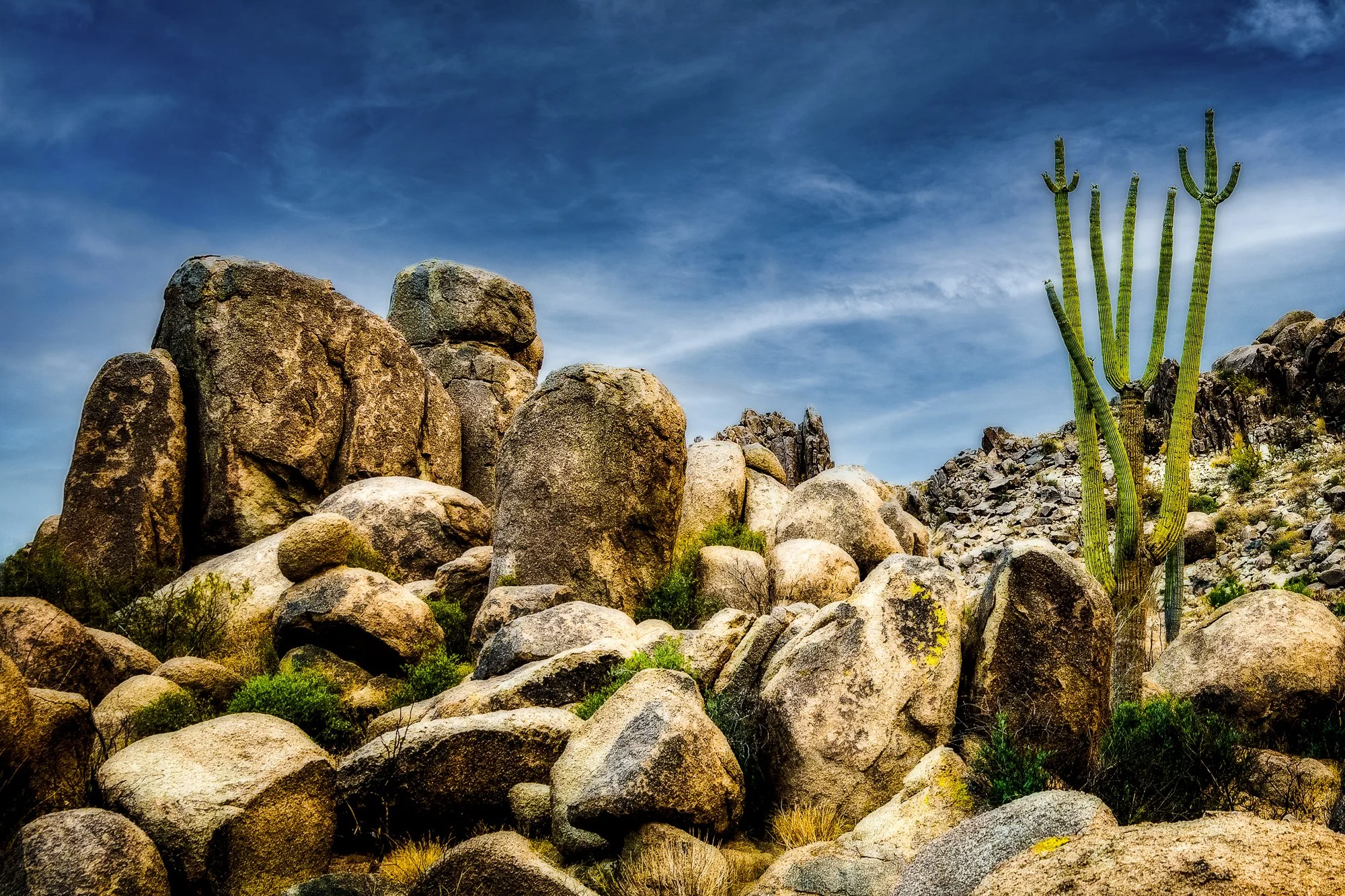 Tough you will see boulders above, the primary focus are the saguaro cacti. The boulders of the Sonoran desert are characterized by erosion, primarily through freeze-thaw conditions that ‘flake off’ small marble-sized pieces. These small, rough stones can be found throughout urban area as residential ‘ground cover’. The surface of most of the boulders below have the texture of a very, very rough sandpaper.