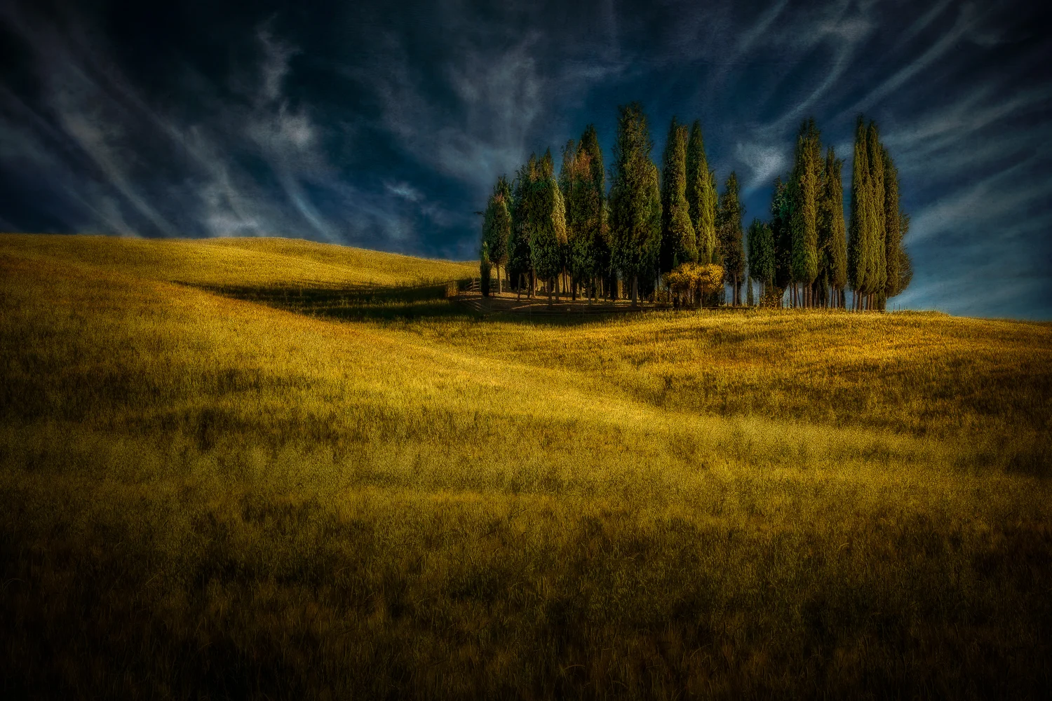Beginning the transformation process for this photo, I decide that the sky is a bit too blah for my taste, so I added clouds photographed on some other day. Here is the next iteration of the photo, with clouds that form leading lines to the copse of cypress.