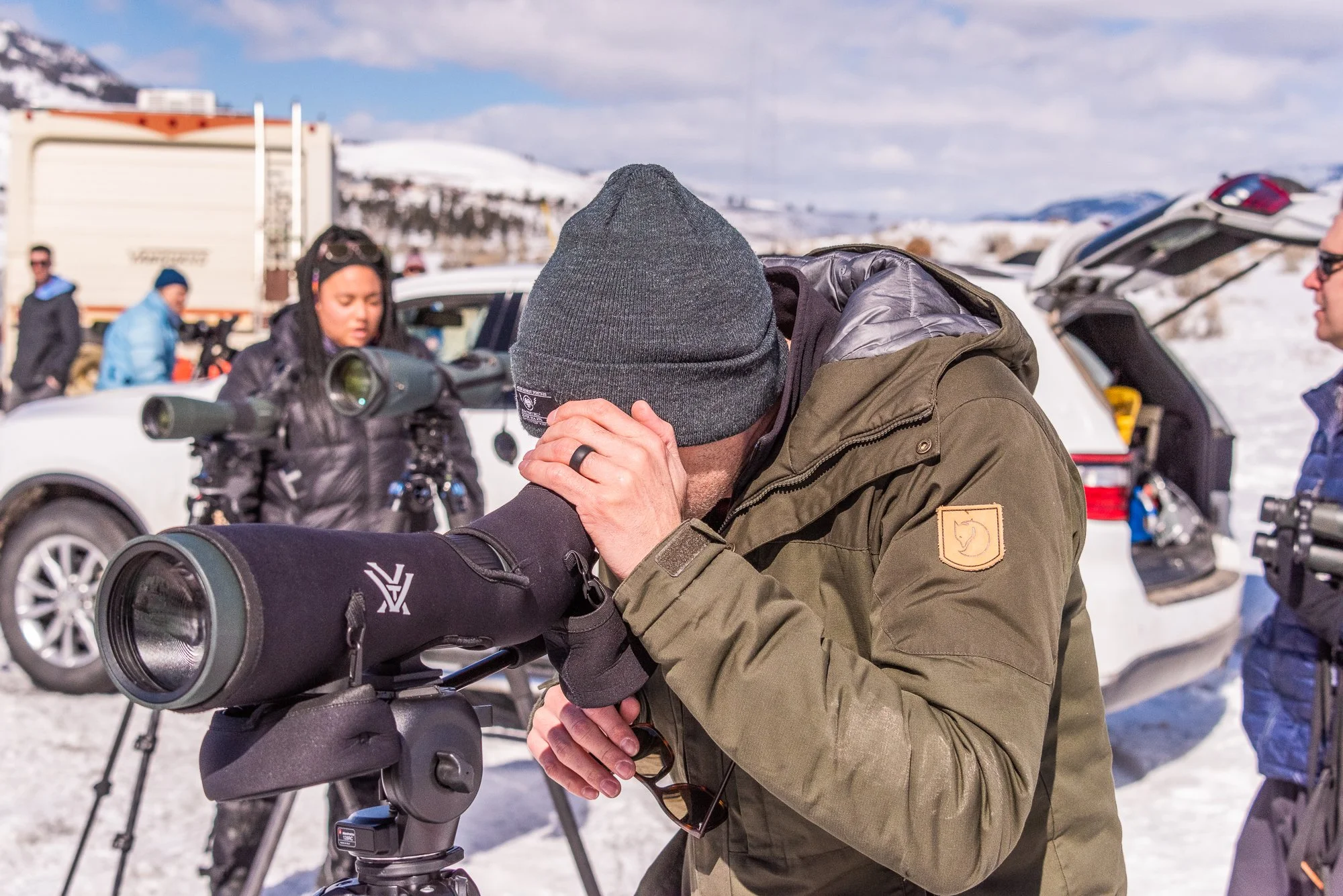 High-powered spotting scopes are brought out on their tripods and the search begins. The wolf docents use their trained eyes to find the wolf pack and then we can each take a look. Here you can see my son Dale getting a general idea of just exactly where the wolves are hanging out. What he is looking for in the spotting scope are landmarks, like a large rock or identifiable copse of trees.
