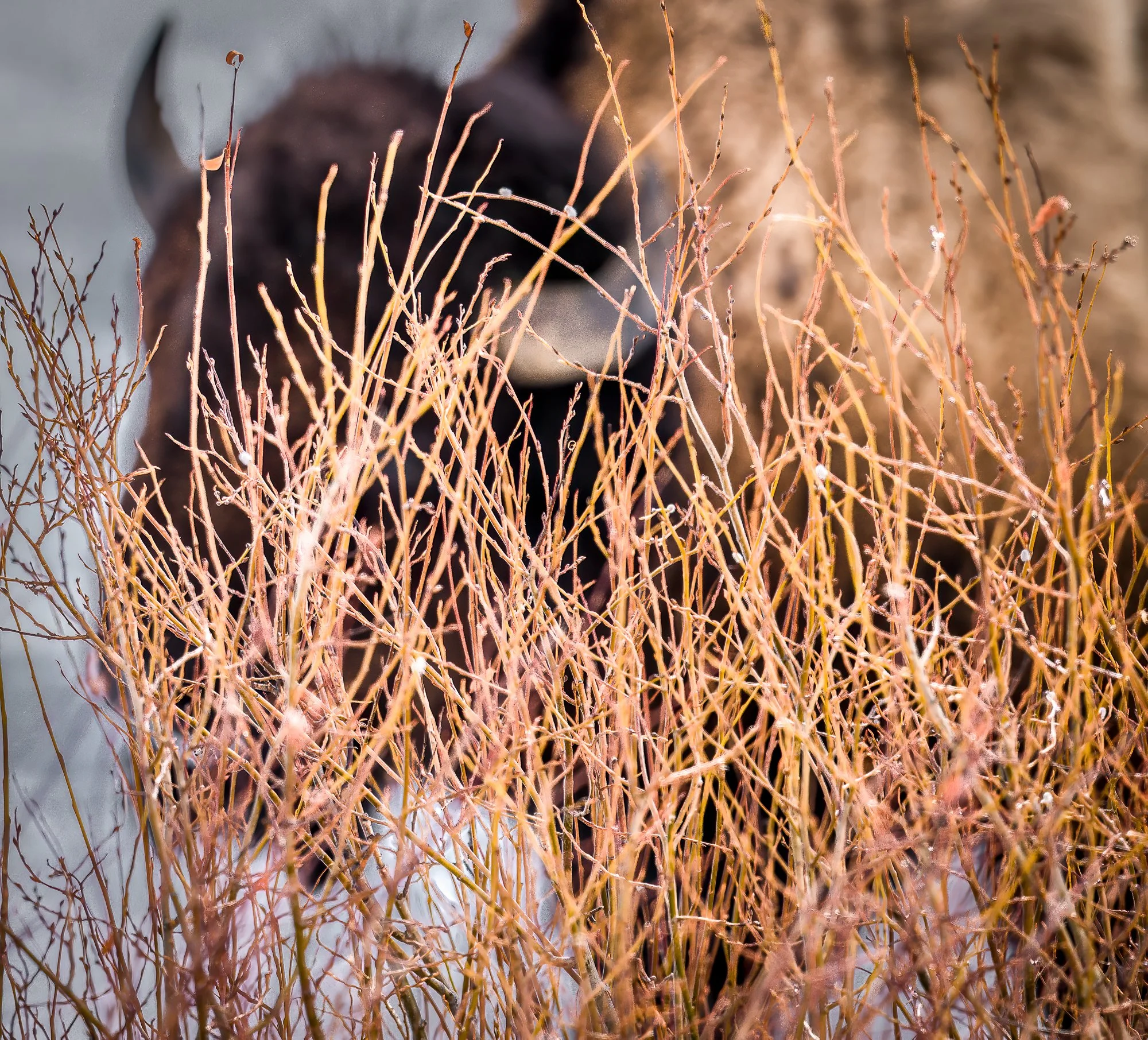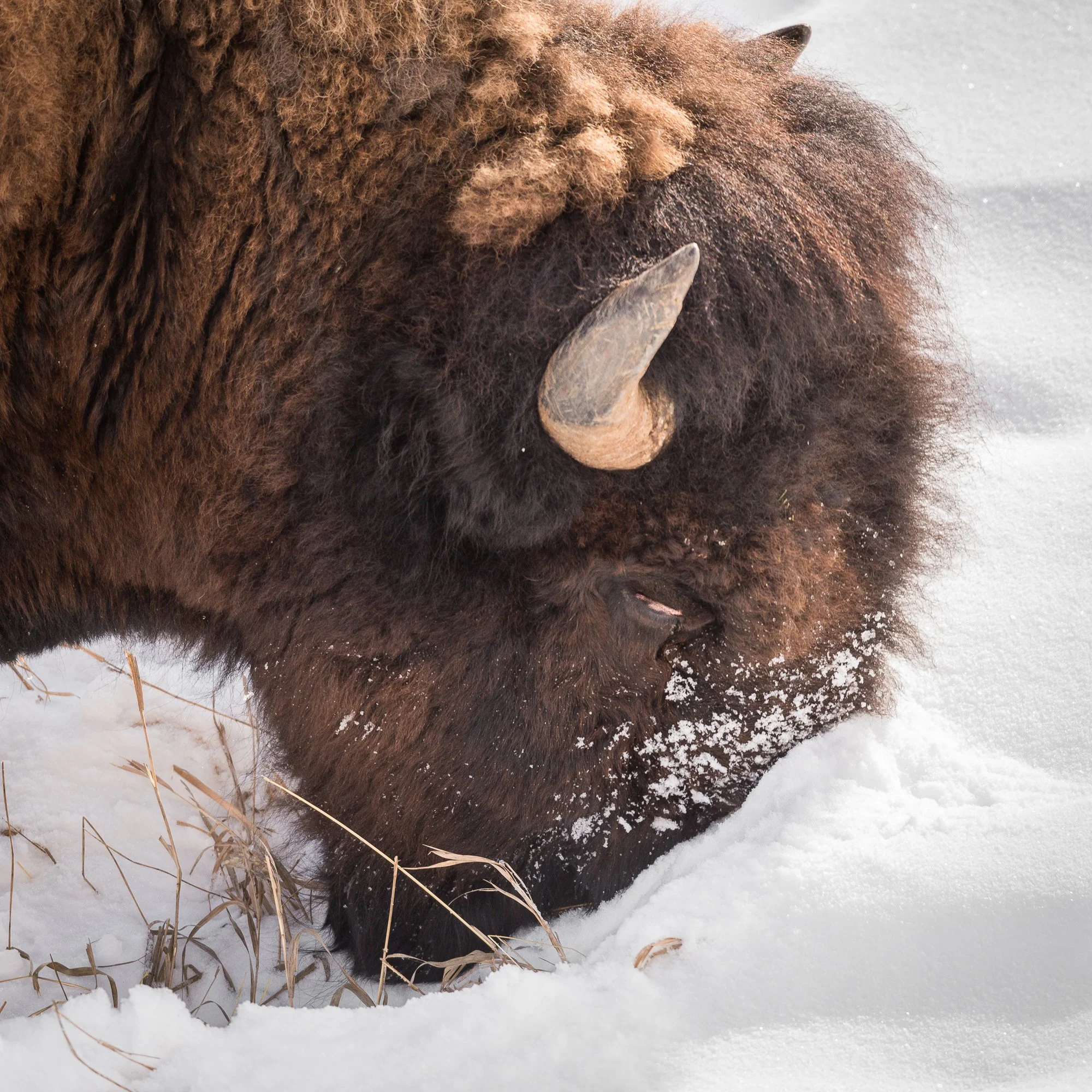 Here you will will see several photos of the bison/buffalo with their head nuzzled down in the snow. This is the way they must graze in the winter. They bulldoze the snow away with their head until they get down to the grasses below. Our guide told us that this is why they have that large hump of muscle on their back…it’s about their winter survival.