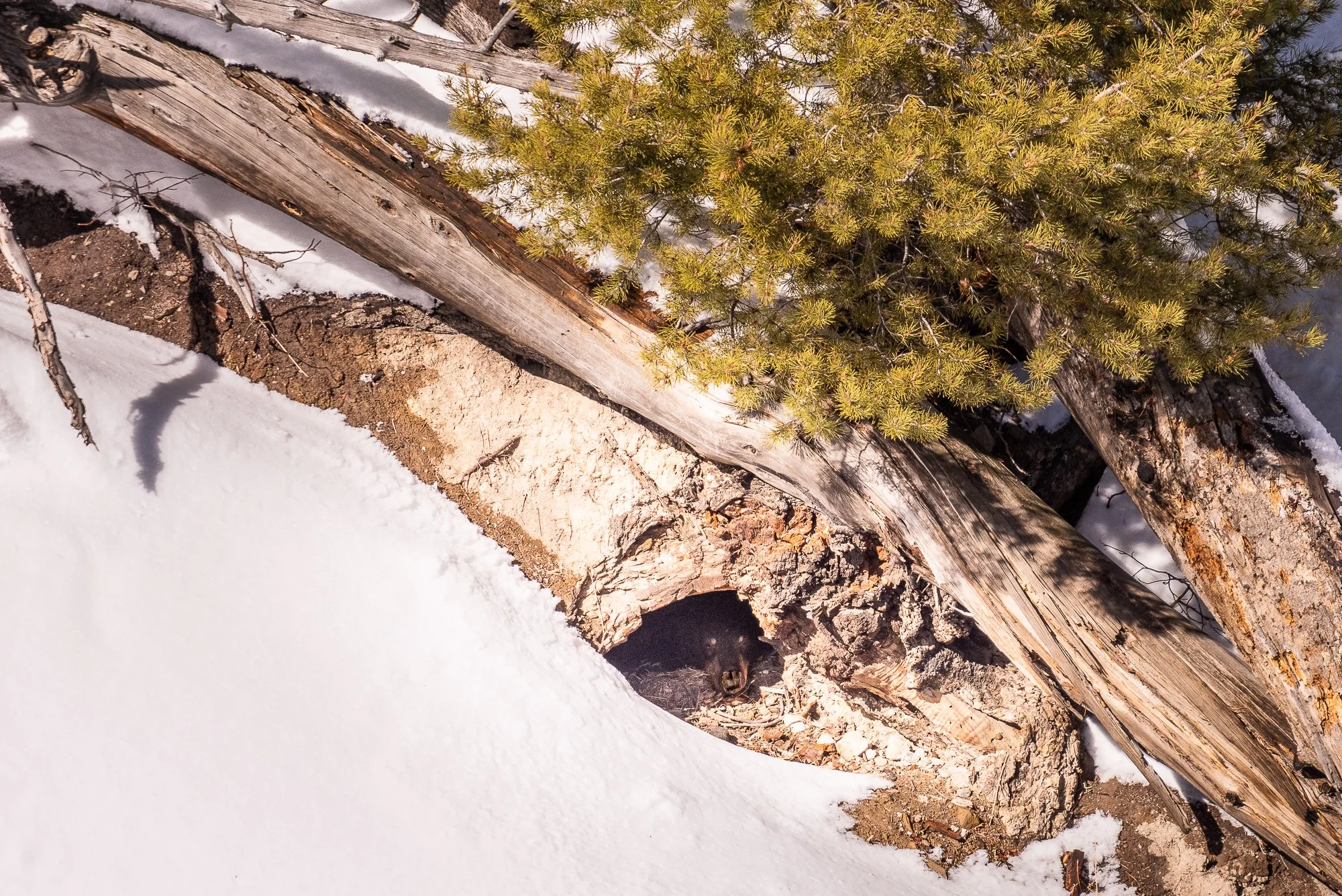 Might the sign below be a warning to be bear aware? Yes, it was. And, we would not have even seen this sleepy fellow if a couple of cars had not been pulled over with their occupants busily staring down the slope. We thought it was an empty hole…until that sleepy bruin stuck his head out to see what all the hubbub was about. This is a photo from the March visit, and he is ready to come out to begin filling his belly.