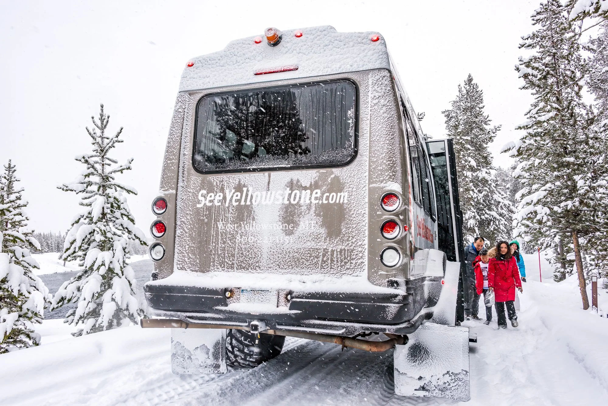 Take a snowcoach to Old Faithful. Another way into Yellowstone NP in the winter is from the town of West Yellowstone, MT. One must either take a guided snowcoach or ride a guided snowmobile between West Yellowstone and Old Faithful Village…and this is a wonderful trip in the winter. You feel that you are just floating along the snow-covered highway on specially designed, extra-large tires. Or, there is the classic, red Bombardier tracked vehicles, if you prefer. You will see photos of both below.